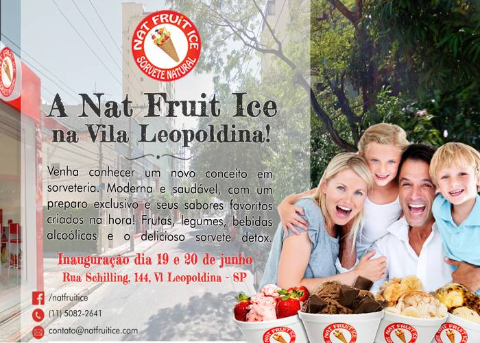A mais nova loja Nat Fruit Ice está localizada na Rua Schilling, 144, bem próxima a Rua Carlos Weber um dos quarteirões mais badalado da Vila Leopoldina .....