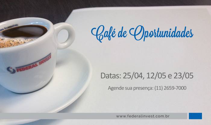 Os próximos Cafés de Oportunidades estão marcados para o dia 25 de abril (sábado) e também 12 (terça-feira) e 23 (sábado) de maio. Para participar é preciso reservar presença através do e-mail franquias@federalinvest.com.br ou tel (11) 2659-7000.