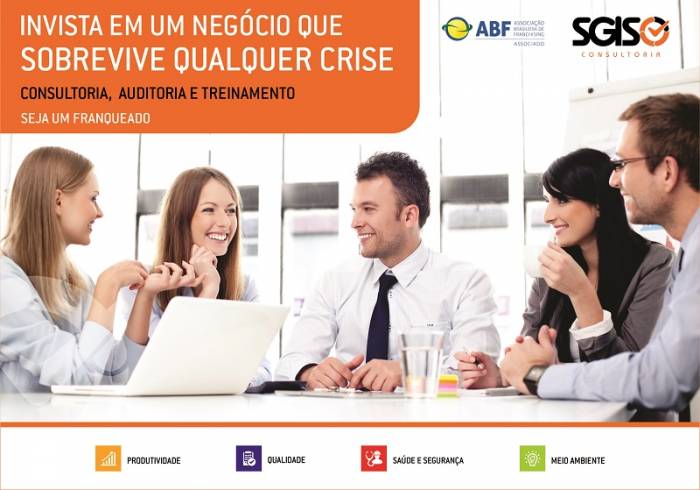 A Franquia SGISO Consultoria, Auditoria e Treinamentos trás para o mercado nacional um novo conceito de Franquias em Consultorias. Trata-se, de um modelo 100% manualizado com as práticas de como Comercializar Consultorias, Auditorias e Treinamentos nos segmentos de Qualidade, Produtividade, Saúde e Segurança e Meio Ambiente. A principal novidade é que não é necessário ser especialista nas áreas de atuação, profissionais de qualquer área do conhecimento pode comercializar os produtos e serviços. A marca ofereçe aos franqueados, todo o treinamento e suporte das atividades principais de uma empresa de consultoria modelo.
